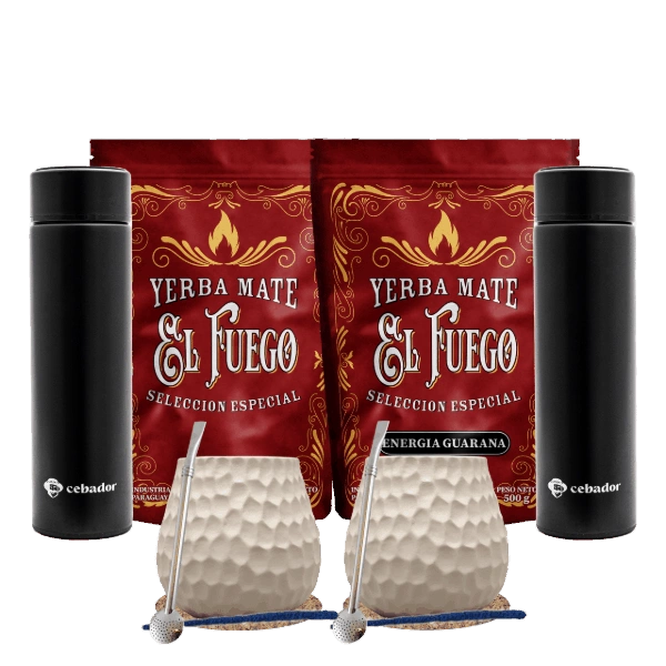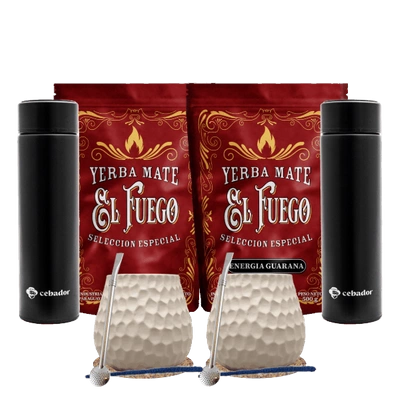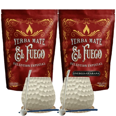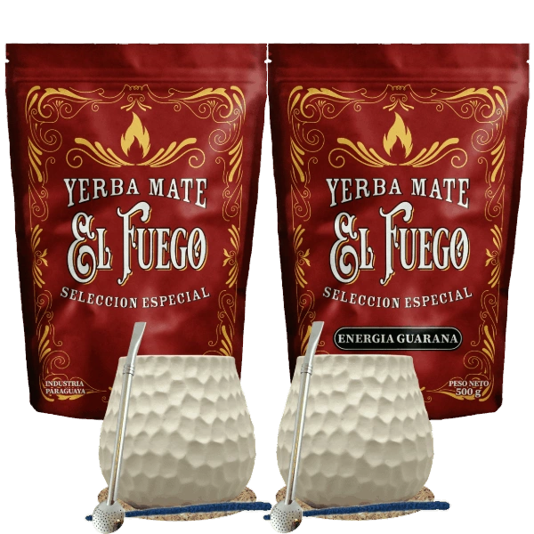 Kit inicial para dois de Erva Mate El Fuego 2×500 g + 2× Cuia + 2× Bombilla