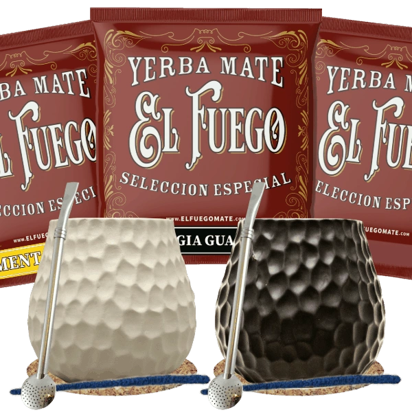 Conjuto de Erva Mate para dois: amostras El Fuego 3x50g + 2x Calabaza + 2x Bombilla