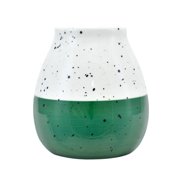 Cabaçade cerâmica "Papagayo " - uma cabaça de erva-mate prática e sólida com uma capacidade de aproximadamente 300-350 ml. A forma da cabaça é inspirada nas cabaças tradicionais da América do Sul. Esmaltada por dentro e por fora. Coberta com um esmalte claro e decorada com padrões pretos, irregularmente salpicados. Apresenta um corte elegante na parte inferior, em cor verde. A cuia de erva-mate de design complementará perfeitamente o equipamento de todos os erveiros!