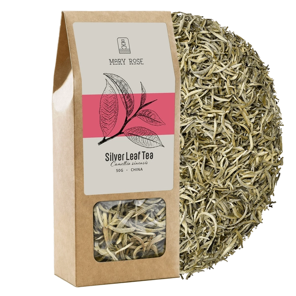 - O Mary Rose Silver Leaf é um chá branco da variedade "Silver Needle". As suas folhas parecem-se exatamente com agulhas de prata. É uma das variedades de chá mais caras do mundo.