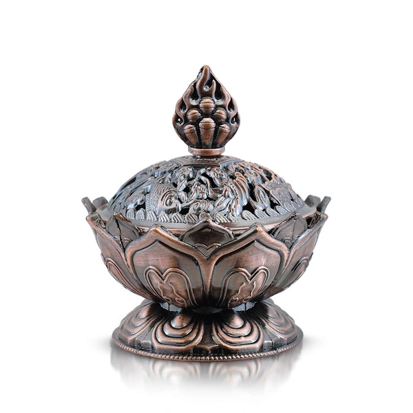 O porta-incenso "Lotus", fabricado em liga de zinco de alta qualidade, num estilo do Extremo Oriente. Os motivos budistas que decoram o suporte - a flor de lótus e o nó sem fim - simbolizam a felicidade e a sabedoria.