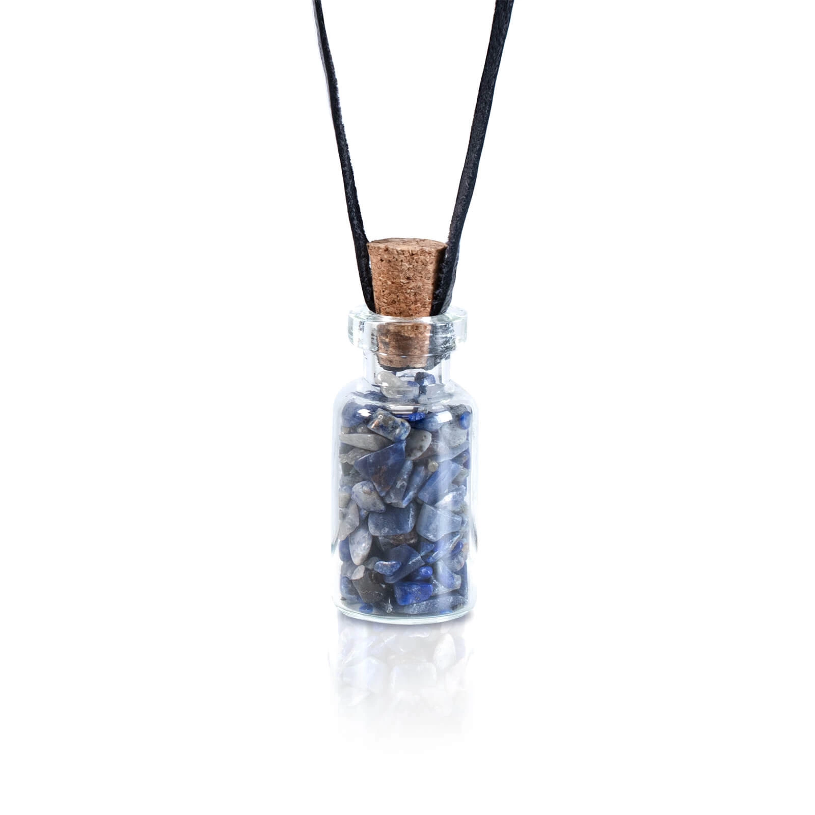 Forma: lápis-lazúli natural encerrado num frasco de vidro com um cordão