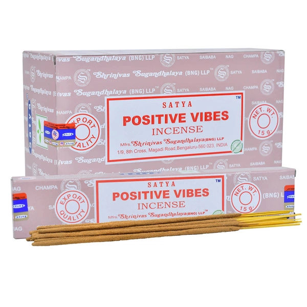 - Incenso Satya Positive Vibes - paus de incenso indiano enrolados à mão com um aroma floral e amadeirado. Acalmam, limpam e elevam as vibrações. Ideal para meditação, yoga e para criar uma atmosfera positiva em casa ou no local de trabalho.