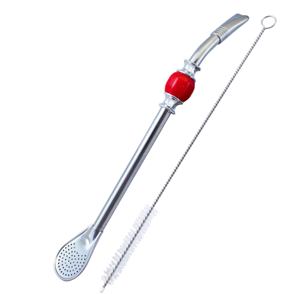 - Bombilla Grande with red cooling stone made of stainless steel. It has a universal spoon type filter. Works perfectly with most types of yerba mate and other infusions.