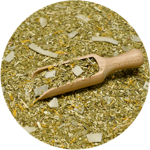 - 🌱 Ingredientes: 87,15% de erva-mate, 8% de lascas de coco, capim-limão, pétalas de calêndula, flores de espinheiro, aroma